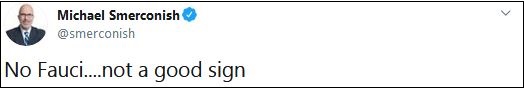 美國有線電視新聞網主持人邁克爾·西門康尼什23日在推特上“吐槽”稱:“沒有福奇…不是個好跡象。”
