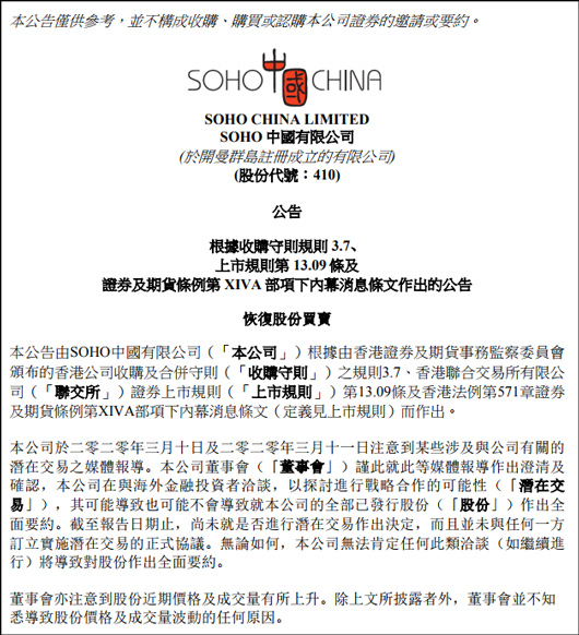 兩週前,SOHO中國曾在港交所公告,稱正在與海外金融投資者洽談,以探討進行戰略合作的可能性,“其可能導致也可能不會導致就公司股份作出全面要約”。