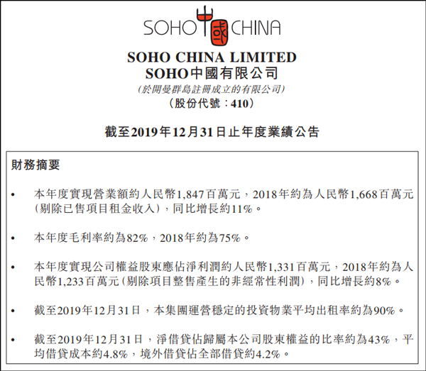 根據SOHO中國今天發佈的年報,截至2019年12月31日,SOHO中國運營穩定的投資物業平均出租率約為90%。