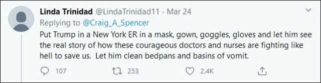 也有一些網友表示,應該讓特朗普戴上口罩、護目鏡、手套,穿上大褂,親自體驗下醫生護士是如何與病毒對抗的,“讓他去打掃盛嘔吐物的便盆和水池。”