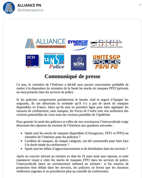 26日,法國“國家聯盟警察”工會發出鄭重聲明,向內政部索要口罩。工會稱沒有口罩的警察將只會是新冠疫情的潛在受害者和傳播人羣。為了警察的健康安全,如果保護裝備再不到位,警察將暫停封禁期間的戒嚴檢查工作,只執行真正的緊急任務。