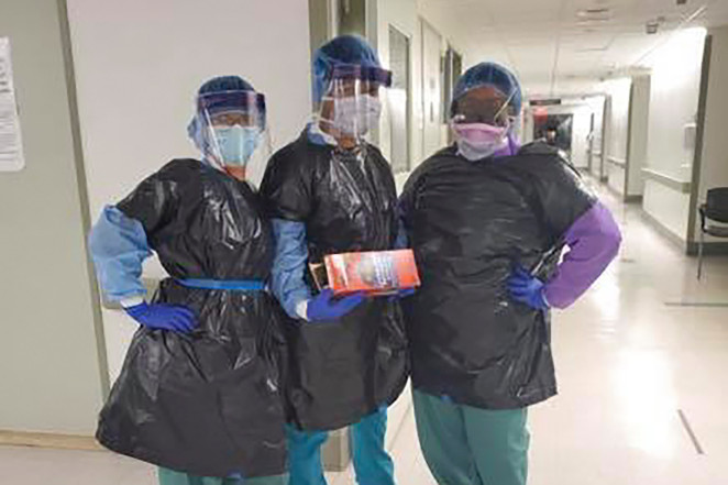 三個醫護人員穿着垃圾袋做的防護服 圖為《紐約郵報》摘自Facebook