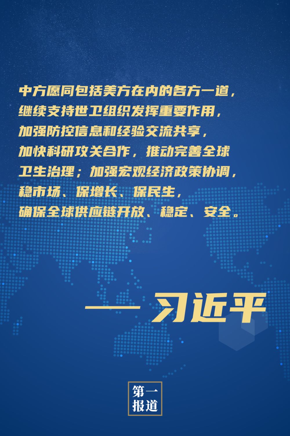 習近平指出,流行性疾病不分國界和種族,是人類共同的敵人。國際社會只有共同應對,才能戰而勝之。在各方共同努力下,昨天舉行的二十國集團領導人應對新冠肺炎特別峯會達成不少共識,取得積極成果。希望各方加強協調和合作,把特別峯會成果落到實處,為加強抗疫國際合作、穩定全球經濟注入強勁動力。中方願同包括美方在內的各方一道,繼續支持世衞組織發揮重要作用,加強防控信息和經驗交流共享,加快科研攻關合作,推動完善全球衞生治理;加強宏觀經濟政策協調,穩市場、保增長、保民生,確保全球供應鏈開放、穩定、安全。