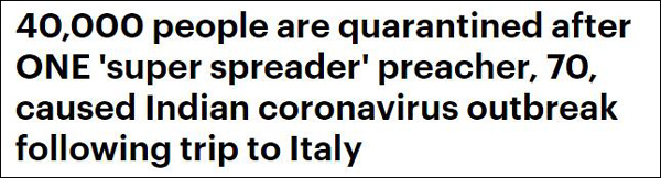 印度一傳教士致19人感染、4萬人被隔離,外媒稱其為“超級傳播者”