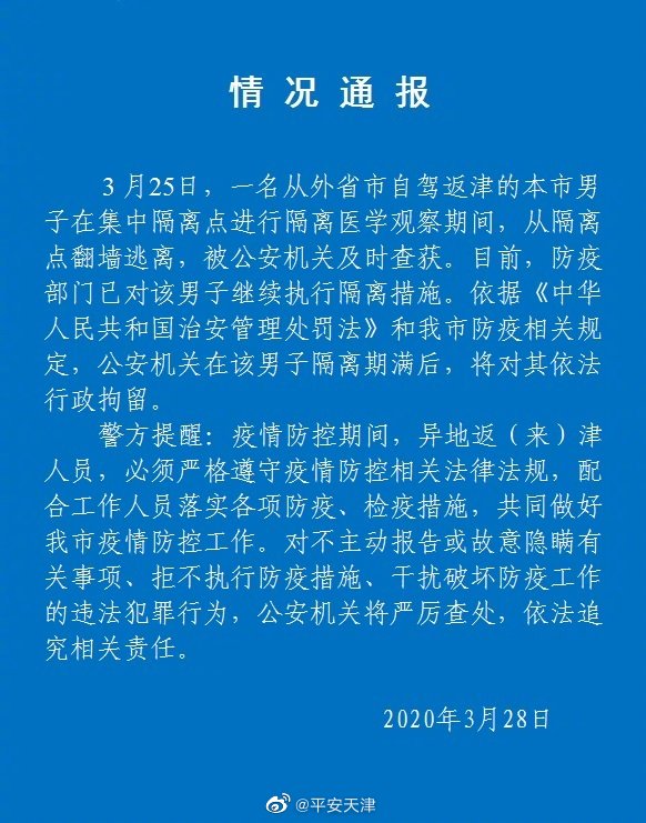據天津市公安局官方微博(@平安天津)3月28日通報,3月25日,一名從外省市自駕返津的本市男子在集中隔離點進行隔離醫學觀察期間,從隔離點翻牆逃離,被公安機關及時查獲。目前,防疫部門已對該男子繼續執行隔離措施。依據《中華人民共和國治安管理處罰法》和我市防疫相關規定,公安機關在該男子隔離期滿後,將對其依法行政拘留。