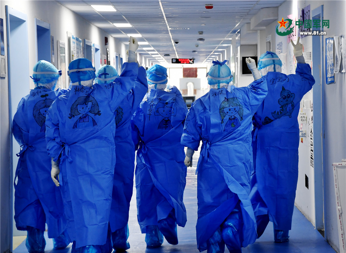 為了讓患者有個好心情,醫護人員利用休息時間在牆上、門上、衣服上都畫滿了卡通畫,患者每天看着這些畫都會開心地合不攏嘴。解放軍報記者 王傳順 攝