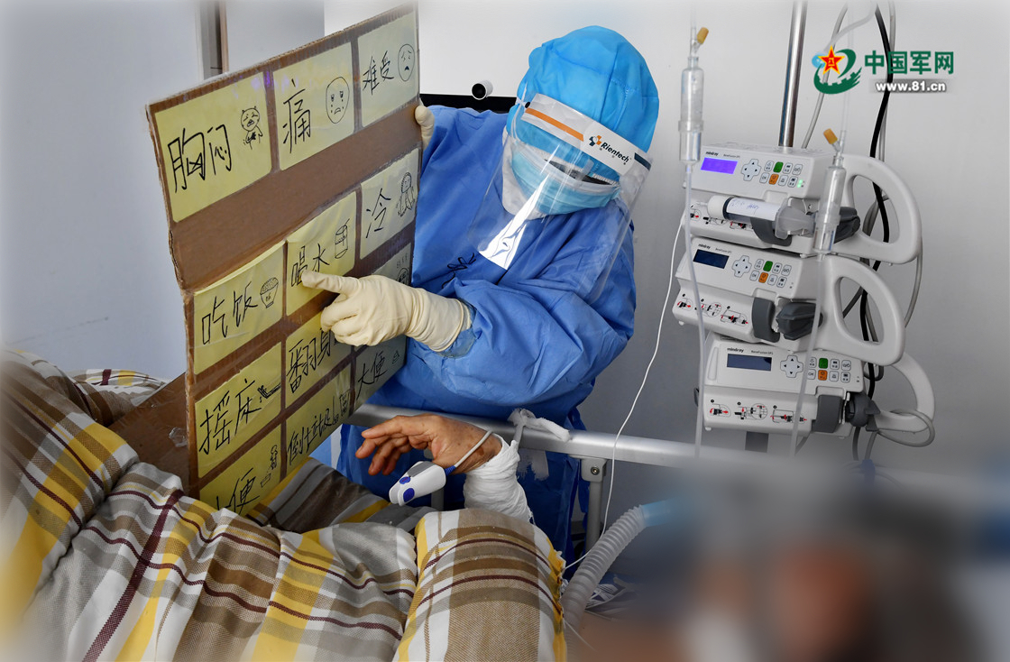 醫護人員自制提示板,為重症患者提供護理服務。解放軍報記者 王傳順 攝
