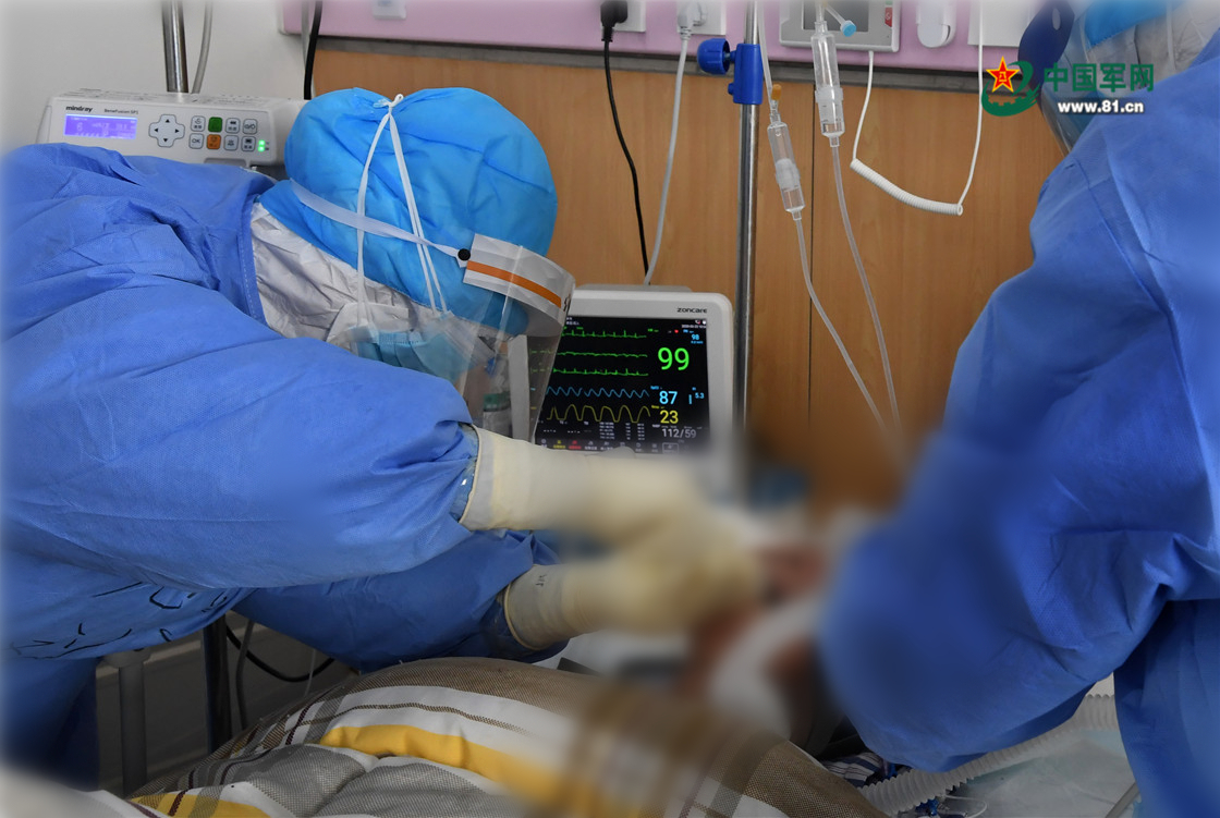 醫護人員正在為患者調整左側頸內靜脈插管位置。解放軍報記者 王傳順 攝