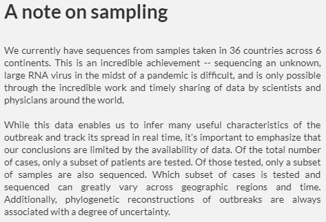 在樣本大增的情況下,Nextstrain還是強調:“重要的是,需要強調我們的結論受數據可獲性的限制。在所有病例中,只有一部分得到了檢測。在檢測的病例中,只有一部分樣本得到了測序。在不同地區、不同時段,哪些樣本被檢測、測序可能變化很大。而且,疫情繫統樹的建構總是有一定的不確定性。”