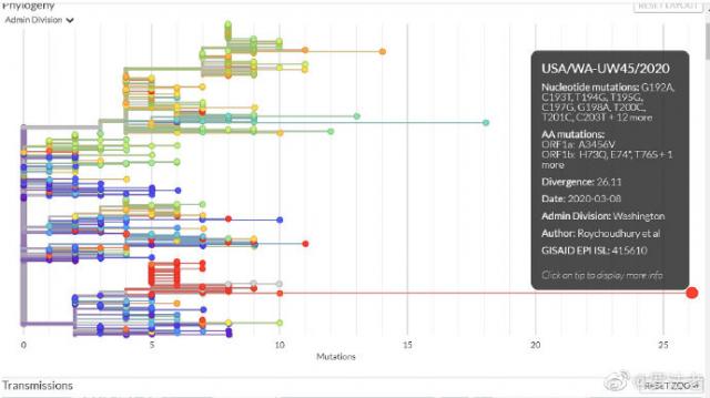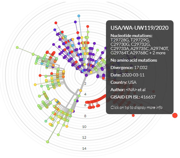 你可以改變圖的參數、圖的“座標”或説“分支長度”(Branch Length,比如上圖的橫座標就是顯示日期的矩形圖,下圖是“極座標”顯示突變數的輻射圖),選擇顏色表示國家或地區還是其他參數,也可以點在某個樣本上,瞭解突變、來源、研究作者等相關信息。