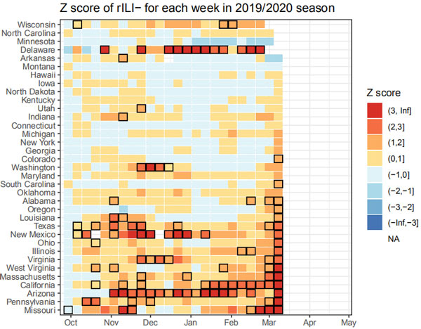 從圖上看,美國有幾個州的Z分數和“相對陰性”,早在10月就開始“爆棚”。似乎是新冠爆發的信號。然而,我不建議以此為論據,因為作者的方法有一個重大缺陷。