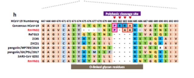 不過,這種“意外”沒有維持太久。3月初發表的研究發現,在狂測了200多個蝙蝠病毒樣本後,取自雲南的蝙蝠冠狀病毒RmYN02有3個氨基酸插入,雖然有一個不同,但新冠的4個插入一下子就沒那麼“不可思議”了。