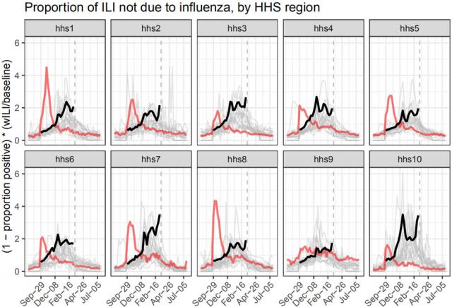 結論是今年的比例(黑線)確實在以往的22年中(灰色)偏高,紅線則是2009年H1N1大爆發的情況。不過,直到2月中旬,今年的“相對陰性”大部分時段都並非最高,不同大區依稀可辨分別有2-5年更高的情況,當然要具體看更高的是哪些年份、有什麼特殊情況才可以進一步討論,但作者並沒有給出。