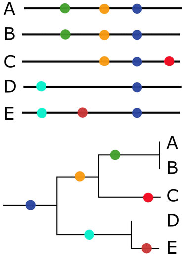 假定你有A-E的5個樣本,不同顏色的點,表示基因差異。藍色點是都有的,而根據黃色與青色,可以分成兩組。為何不用綠色與青色分組?因為黃色的範圍大於綠色。
