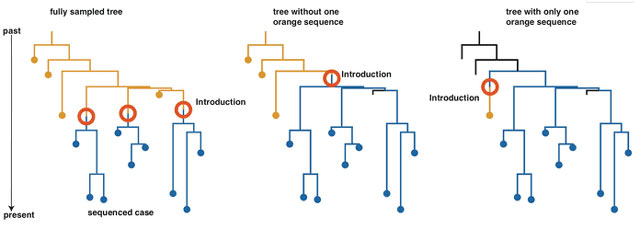 例子是這樣的:假定黃國的病原有三支傳入藍國,如果所有圖上這些點全部測到,相當於開啓“上帝視角”,就能像第一幅圖那樣準確還原全貌。但如果少測了第一幅圖中右側的黃點,那麼就會像第二幅圖那樣,誤認為是單次傳入,而且時間也提前了。更極端的例子是,假如只測到一個黃點,甚至會得出完全相反的結論。