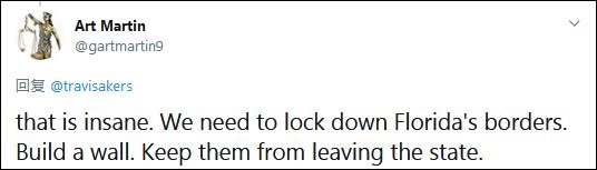 有個網民諷刺稱:“太瘋狂了,我們得關閉佛羅里達的邊境,造一堵牆,禁止他們(佛羅里達人)離開本州。”