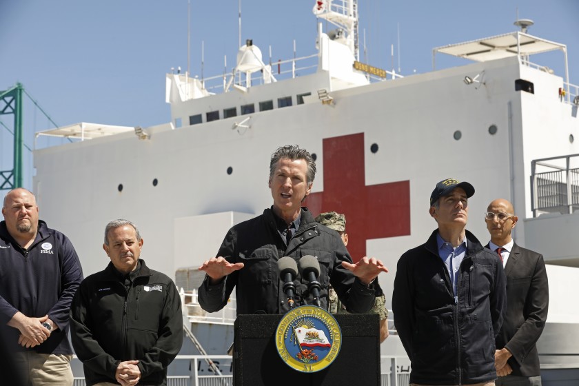 加州州長在新聞發佈會上講話(《洛杉磯時報》圖)