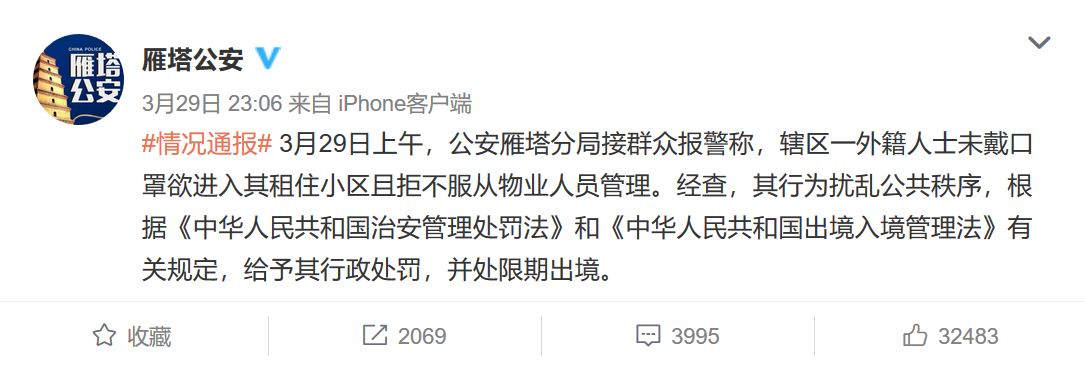 西安市公安局雁塔分局官方微博@雁塔公安 3月29日深夜通報,當天上午,公安雁塔分局接羣眾報警稱,轄區一外籍人士未戴口罩欲進入其租住小區且拒不服從物業人員管理。經查,其行為擾亂公共秩序,根據《中華人民共和國治安管理處罰法》和《中華人民共和國出境入境管理法》有關規定,給予其行政處罰,並處限期出境。
