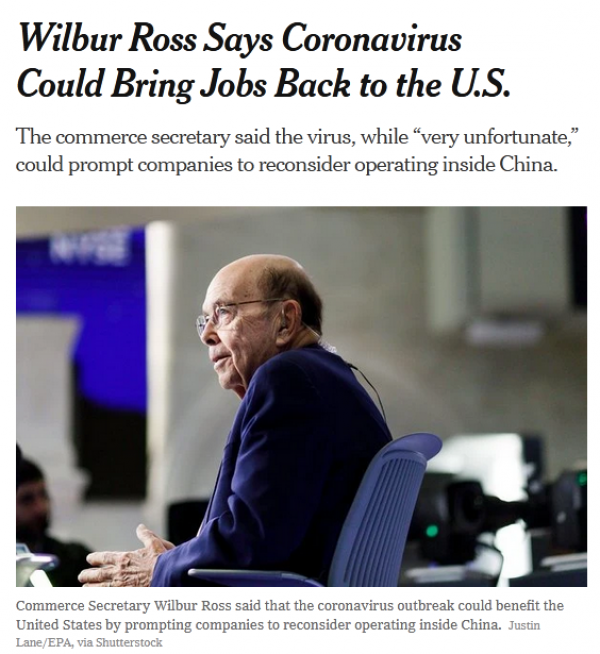 美商務部長羅斯1月表示,中國爆發疫情絕非幸事,但能讓工作機會迴流美國 (圖自南華早報)