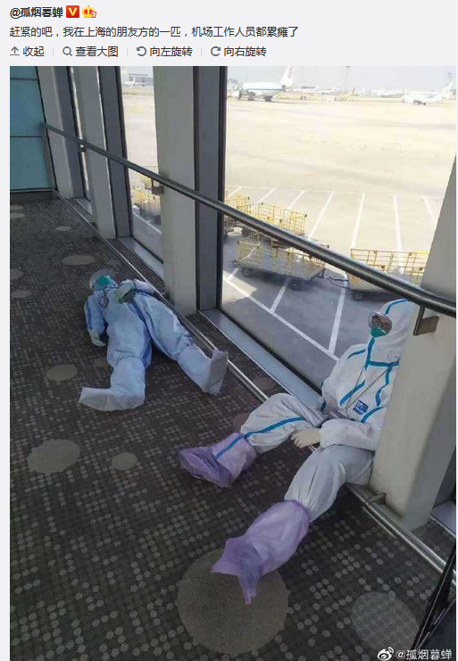 筆者在虹橋機場作為支援力量在現場引導國內入港旅客時每次執勤4小時。結束了4小時的執勤引導無數旅客之後,只想癱坐在椅子上不想站起來了。執勤四小時尚且如此,連續在現場執勤十幾小時,還是強度更高的國際進港旅客,其對人體負擔可想而知,在社交媒體上也能看到穿着全套防護服的工作人員實在吃不消在廊橋上靠着就睡着了的畫面。