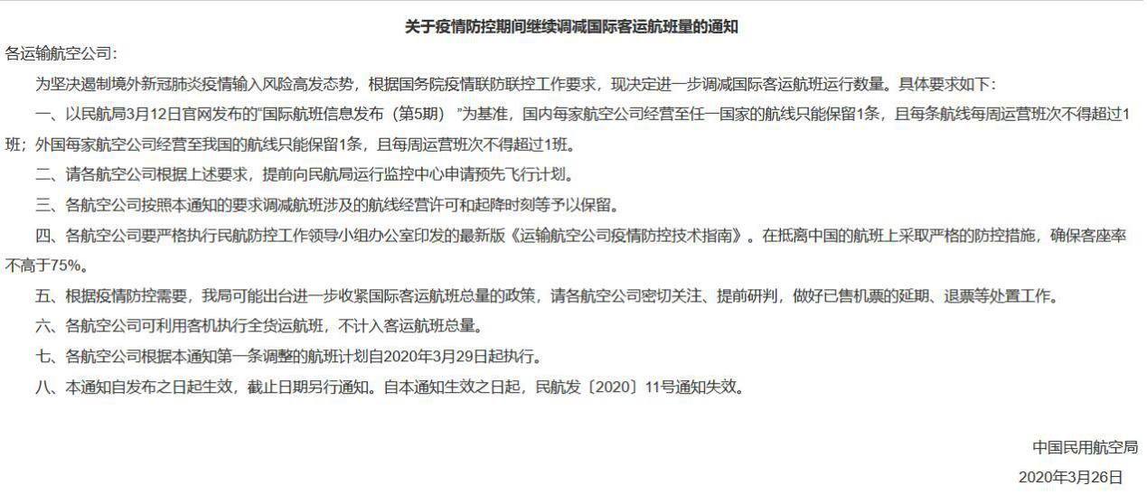 這些措施有效地控制了外來輸入型病例對國內倒灌所帶來的第二波爆發,但日益嚴峻的輸入型病例形勢以及越來越多的疫情重點防控國家給國內機場帶來了巨大的壓力。最終在3月26日晚上民航局發佈了《關於疫情防控期間繼續調減國際客運航班量的通知》,其中最重要的是宣佈:
