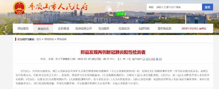 29日,平頂山市人民政府官網也發佈了一則《郟縣發現兩例新冠肺炎陽性檢測者》的信息,“3月25日,為儘快全面複診,郟縣人民醫院在對醫護人員進行健康體檢核酸篩查(非定點核酸檢測機構)時,發現劉某仁核酸檢測單陽性(春節前有武漢旅居史,返郟後自行隔離14天,經檢查無症狀後上班),張某領、周某鋒與其有密切接觸史……”
