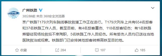 據@廣州鐵路3月30日消息,京廣鐵路T179次列車脱線事故救援工作正在進行。T179次列車上共有654名旅客和37名鐵路工作人員,截至目前,有4名旅客重傷、118名旅客輕傷;有1名鐵路乘警經現場搶救後不幸殉職,5名鐵路工作人員輕傷。所有受傷人員均已送往當地醫院救治或觀察。鐵路部門已安排其他旅客轉乘高鐵至目的地。