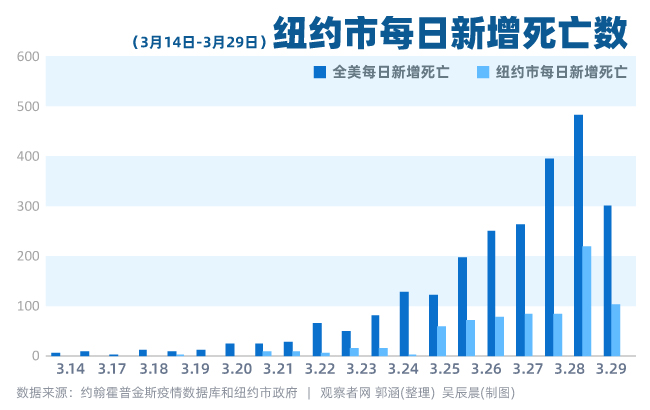 從22日起的過去一週內,紐約市死亡人數快速增加,從63例上漲到776例。就每日新增數字來説,幾乎佔全美的近三分之一。