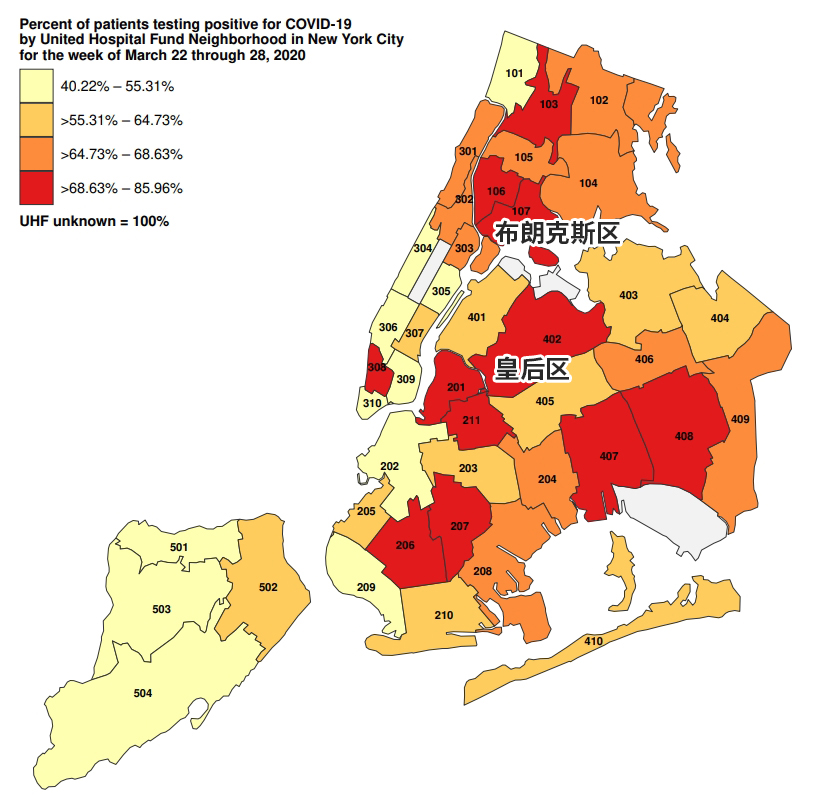 根據紐約市政府的數據,最貧窮社區遭受疫情打擊最為嚴重。截至28日,皇后區佔全市超過3萬名確診患者的32%。該區傑克遜高地、艾姆赫斯特、可樂娜等普遍貧窮、有着大量外國族裔的社區,約69%到86%的接受檢測者結果為陽性。