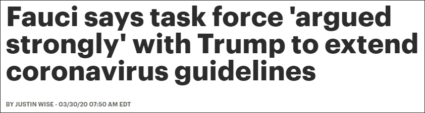 福奇則説,30日在白宮橢圓辦公室,他與新冠病毒工作組協調員黛博拉·比克斯一同向特朗普展示了數據模型,包括紐約、新奧爾良等城市的確診數據,試圖告訴對方疫情在美國的增長速度並沒有出現放緩的跡象。