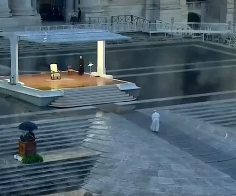往日,教皇方濟各(Papst Franziskus )如果公開發表文告,彼得廣場上一定人山人海;今天,我們看到的卻是一幅完全不同的場景:教皇孤零零地站在那兒,廣場上門可羅雀。