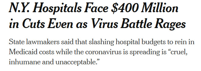 今年年初,紐約州州長安德魯·科莫(Andrew M. Cuomo)曾召集一個專門小組提議削減醫療開支,控制該州不斷增長的醫療補助項目以節省約25億美元,其中涉及削減約4億美元的醫院開支。然而這一提案在3月中旬才正式公佈,此時疫情已在美國擴散。這一提案對美國抗疫第一線的紐約醫護人員的士氣造成巨大打擊。