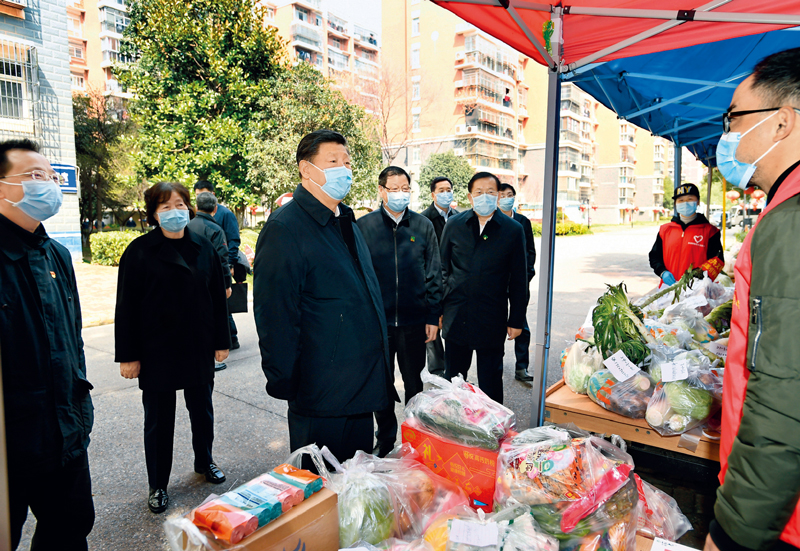 2020年3月10日,中共中央總書記、國家主席、中央軍委主席習近平專門赴湖北省武漢市考察新冠肺炎疫情防控工作。這是習近平在東湖新城社區生活物資集中配送點,詳細詢問社區羣眾生活物資採購和供應情況。 新華社記者 謝環馳/攝