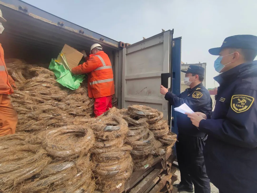 “海關發佈”微信公眾號4月10日消息:4月7日,天津海關所屬東疆海關在查驗一票申報單一品名為“黑鐵絲”的出口貨物時,查獲夾藏在同一集裝箱內的企圖以瞞報方式出口的口罩約111650只。