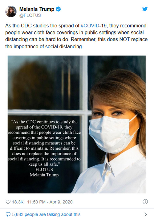 特朗普夫人援引美國疾病控制與預防中心(CDC),建議道:“人們應在公共場合佩戴布質口罩,因為在公共場合社交隔離(social distancing)措施很難得到保持。記住,這並不能取代社交隔離的重要性。”
