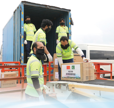 3月28日,中國政府赴巴基斯坦抗疫醫療專家組抵達伊斯蘭堡。圖為巴方工作人員卸載同機運抵的援助醫療物資。 人民日報記者 丁雪真攝