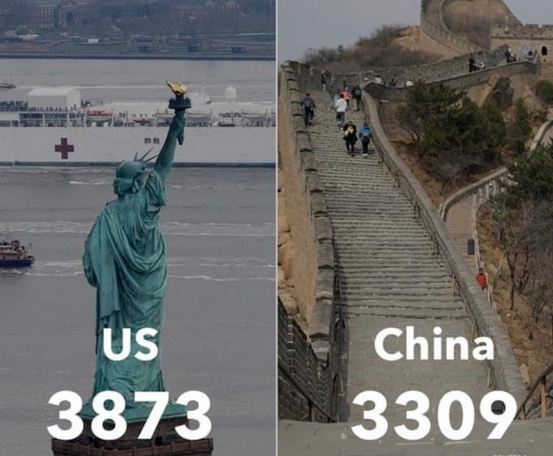 其實,北京時間4月1日上午4點55分,約翰斯·霍普金斯大學統計顯示美國新冠肺炎累計確診184183例,累計死亡3721例,當時就已經超過中國的3305例。“美國之音”讓白宮不滿的對比圖是這張配文“美國死亡病例超過中國”的圖: