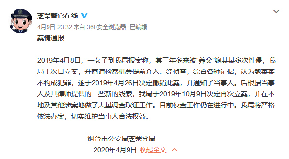 4月9日晚,山東煙台市公安局芝罘分局發佈案情通報:2019年4月8日,一女子到我局報案稱,其三年多來被“養父”鮑某某多次性侵,我局於次日立案,並商請檢察機關提前介入。經偵查,綜合各種證據,認為鮑某某不構成犯罪,遂於2019年4月26日決定撤銷此案,並通知了當事人。後根據當事人及其律師提供的一些新的線索,我局於2019年10月9日決定再次立案,並在本地及其他涉案地做了大量調查取證工作。目前偵查工作仍在進行中。我局將嚴格依法辦案,切實維護當事人合法權益。