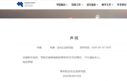 西南政法大學商學院網站4月10日發佈聲明,商學院法治企業研究院已解除鮑毓明兼職研究員的聘任,並已通知本人。