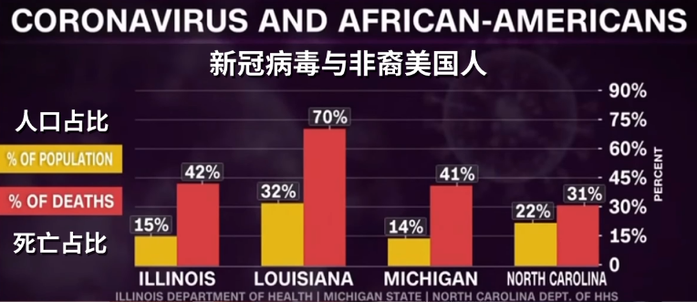 在芝加哥,新冠肺炎死亡病例中非裔美國人佔比為72%,而非裔美國人在該市人口占比僅為30%。在密歇根州,新冠肺炎死亡病例中非裔美國人佔比為41%,而非裔美國人在該州人口占比僅為14%。