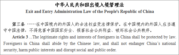 一、根據《中華人民共和國憲法》和《中華人民共和國出境入境管理法》,在中國境內的外國人的合法權益和利益受法律保護,在中國境內的外國人應當遵守中國法律,不得危害中國國家安全、損害社會公共利益、破壞社會公共秩序。