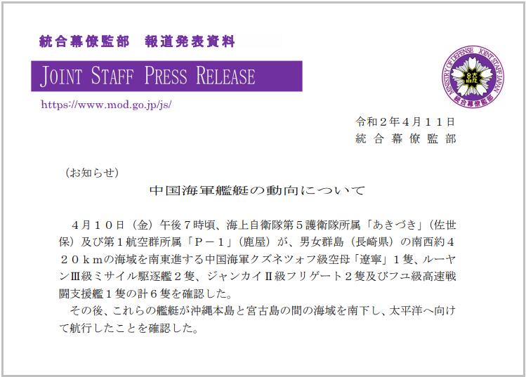 (觀察者網訊)日本防衞省統合幕僚監部4月11日發佈消息稱,當地時間4月10日19時,日本海上自衞隊第五護衞羣“秋月號“護衞艦以及日本航空自衞隊第一航空羣P-1海上巡邏機發現:中國海軍航母“遼寧”艦、054A型導彈護衞艦“棗莊”艦、“日照”艦、901型遠洋綜合補給艦“呼倫湖”艦以及052D型導彈驅逐艦“西寧”艦、“貴陽”艦等6艦船,自日本長崎縣男女羣島西南420公里處公海水域處往東南方向航行,並穿越宮古海峽,駛入太平洋。