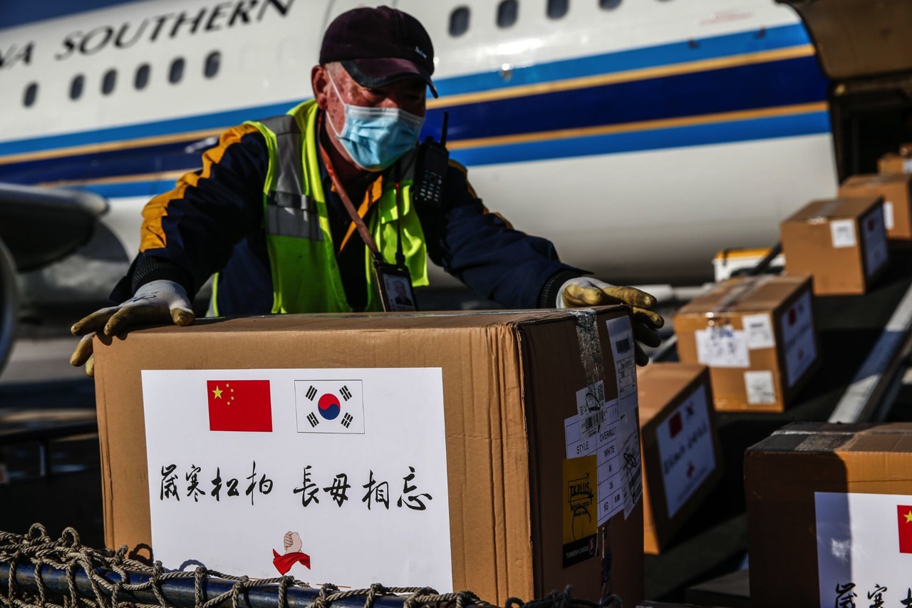 3月16日,瀋陽桃仙國際機場,工作人員將捐贈韓國的防疫物資裝機。圖自新華社