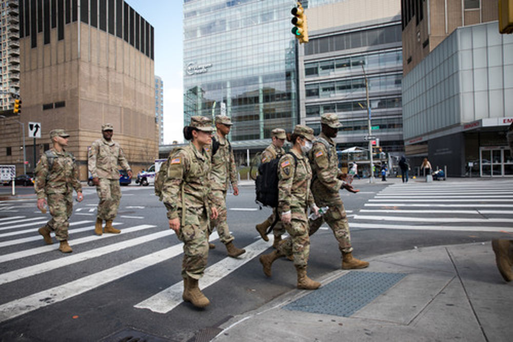 4月8日,在美國紐約,美軍士兵從一家醫院外走過。新華社發(郭克攝)