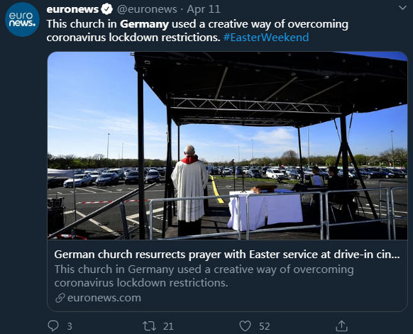 今年的“復活節”非同尋常,世界各地正在程度不同地戰鬥在抗疫的“生死線”上。由於許多國家禁止包括宗教儀式在內的各種集會,從教宗到下面的神父們,都不得不面對空空如也的教堂,通過現代通訊工具,向困在家中的信眾們發出鼓舞的信息。有些不願放棄傳統形式的教區,設法租下“汽車電影院”(Drive-in theater)這類設施,以便信眾們共同慶祝耶穌的復活。