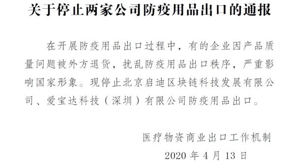 通報稱:在開展防疫用品出口過程中,有的企業因產品質量問題被外方退貨,擾亂防疫用品出口秩序,嚴重影響國家形象。現停止北京啓迪區塊鏈科技發展有限公司、愛寶達科技(深圳)有限公司防疫用品出口。