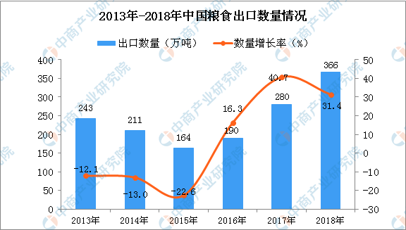 2018年中國糧食出口量為366萬噸同比增長31.4% 數據來源:中商產業研究院