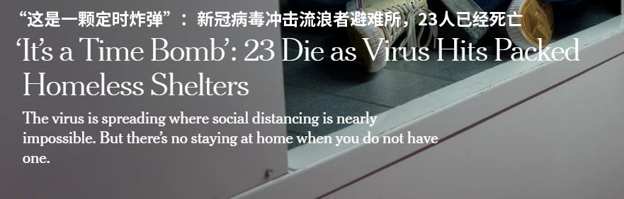 根據流浪者服務部門(Department of Homeless Services)的官方數據,**截至12日,紐約已有23名收容所居民在醫院死亡。來自收容所的371人的病毒檢測呈陽性,**其中約80%來自單身成年人的收容設施。但《紐約時報》指出,這並不能反映真正的感染人數,因為只有病的很重的流浪者才會被發現。