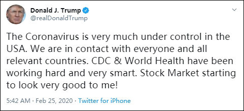 特朗普2月底發推,美國疫情得到控制,WHO“非常聰明”