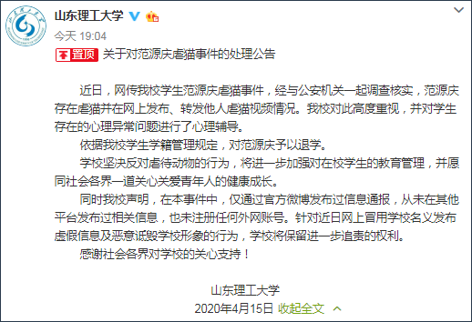 山東理工大學官方微博(@山東理工大學 )4月15日發佈《關於對範源慶虐貓事件的處理公告》,稱近日,網傳我校學生範源慶虐貓事件,經與公安機關一起調查核實,範源慶存在虐貓並在網上發佈、轉發他人虐貓視頻情況。我校對此高度重視,並對學生存在的心理異常問題進行了心理輔導。